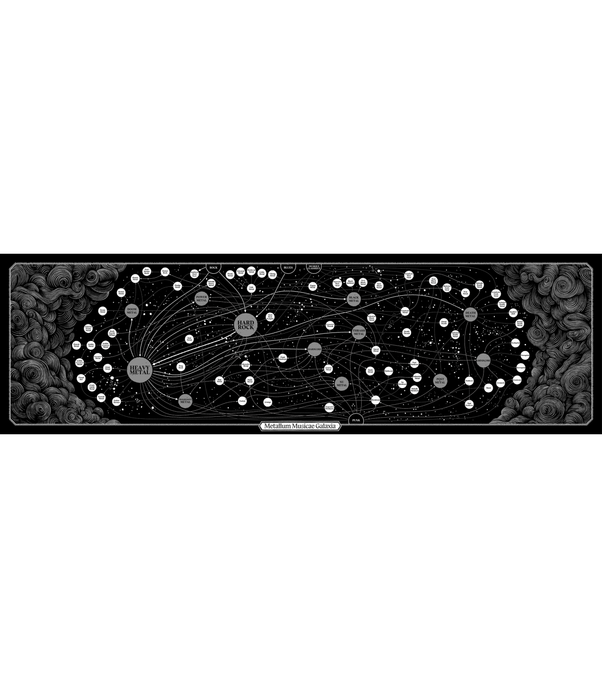Réalisé à partir d'une illustration originale de FØRTIFEM, carte réalisée dans le cadre de l'exposition "Metal : Diabolus in Musica"à la Philharmonie de Paris en 2024 pour mettre en lumière les différents genres du Metal et leurs ramifications.