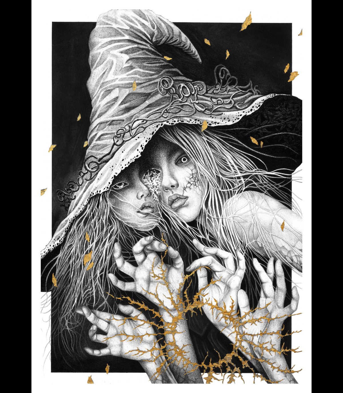 technique mixte, poudre de graphite , crayon graphite , encre de chine et lavis d'encre, feuille d'or sur papier Arches 300g/m2 grain satiné .
