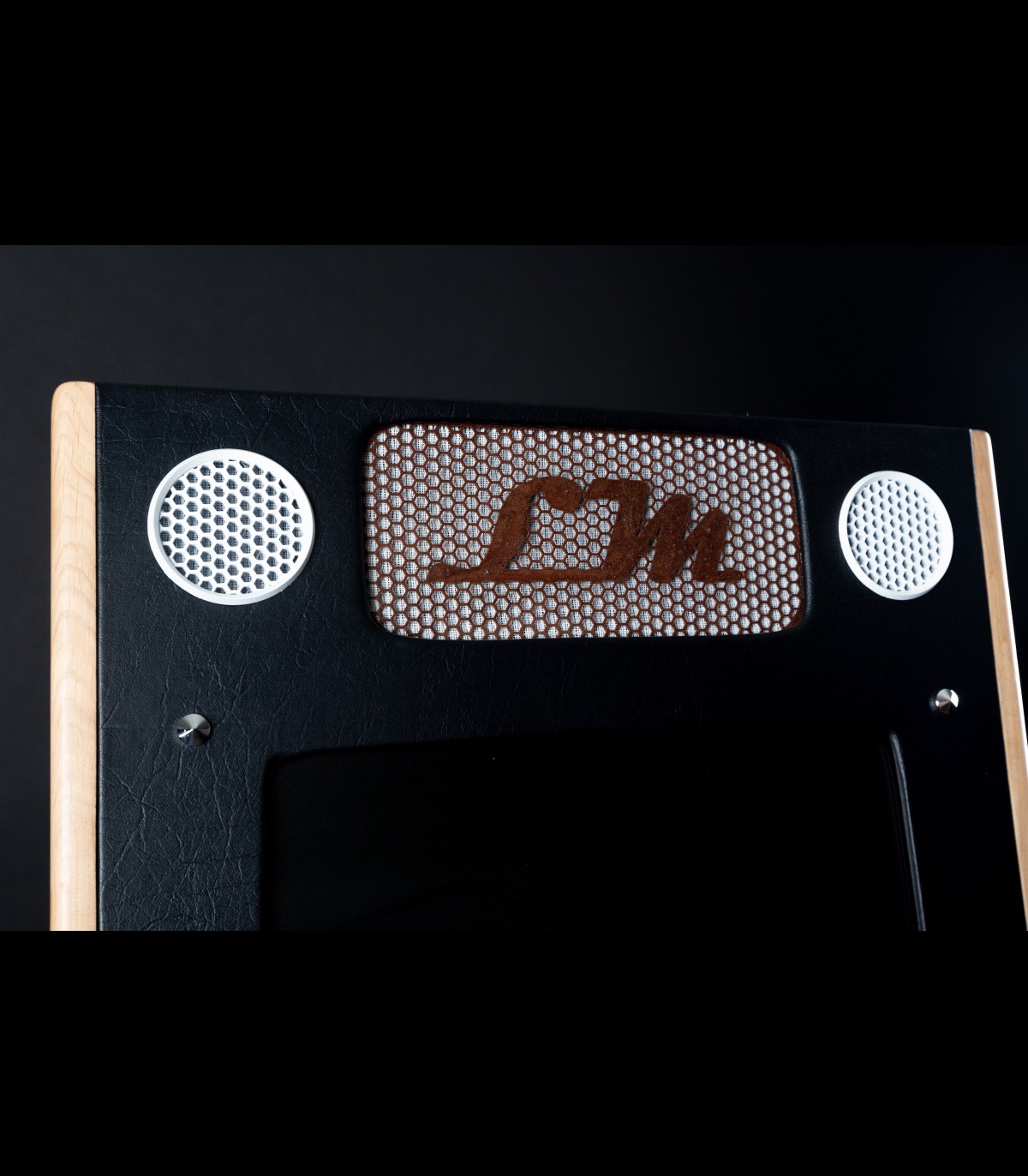 Une façade en simili cuir blanc texturée en relief. Le simili utilisé est un revêtement pour ampli de guitare type Marshall pour une finition haut de gamme.
